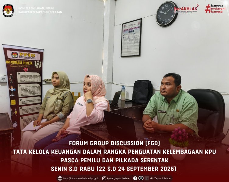 TemanPemilih, Komisi Pemilihan Umum Kabupaten Tapanuli Selatan mengikuti kegiatan Forum Group Discussion (FGD) Tata Kelola Keuangan dalam rangka penguatan kelembagaan KPU pasca Pemilu dan Pilkada Serentak, yang diselenggarakan oleh Komisi Pemilihan Umum Republik Indonesia secara daring melalui Zoom Meeting, Senin s.d Rabu (22 s.d 24 September 2025).