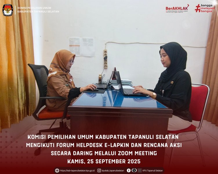TemanPemilih, Komisi Pemilihan Umum Kabupaten Tapanuli Selatan mengikuti kegiatan Forum Helpdesk Pengisian Rencana Aksi dan Penginputan Capaian Kinerja pada Aplikasi E-Lapkin, yang diselenggarakan oleh Komisi Pemilihan Umum Republik Indonesia secara daring melalui Zoom Meeting, Kamis (25 September 2025).