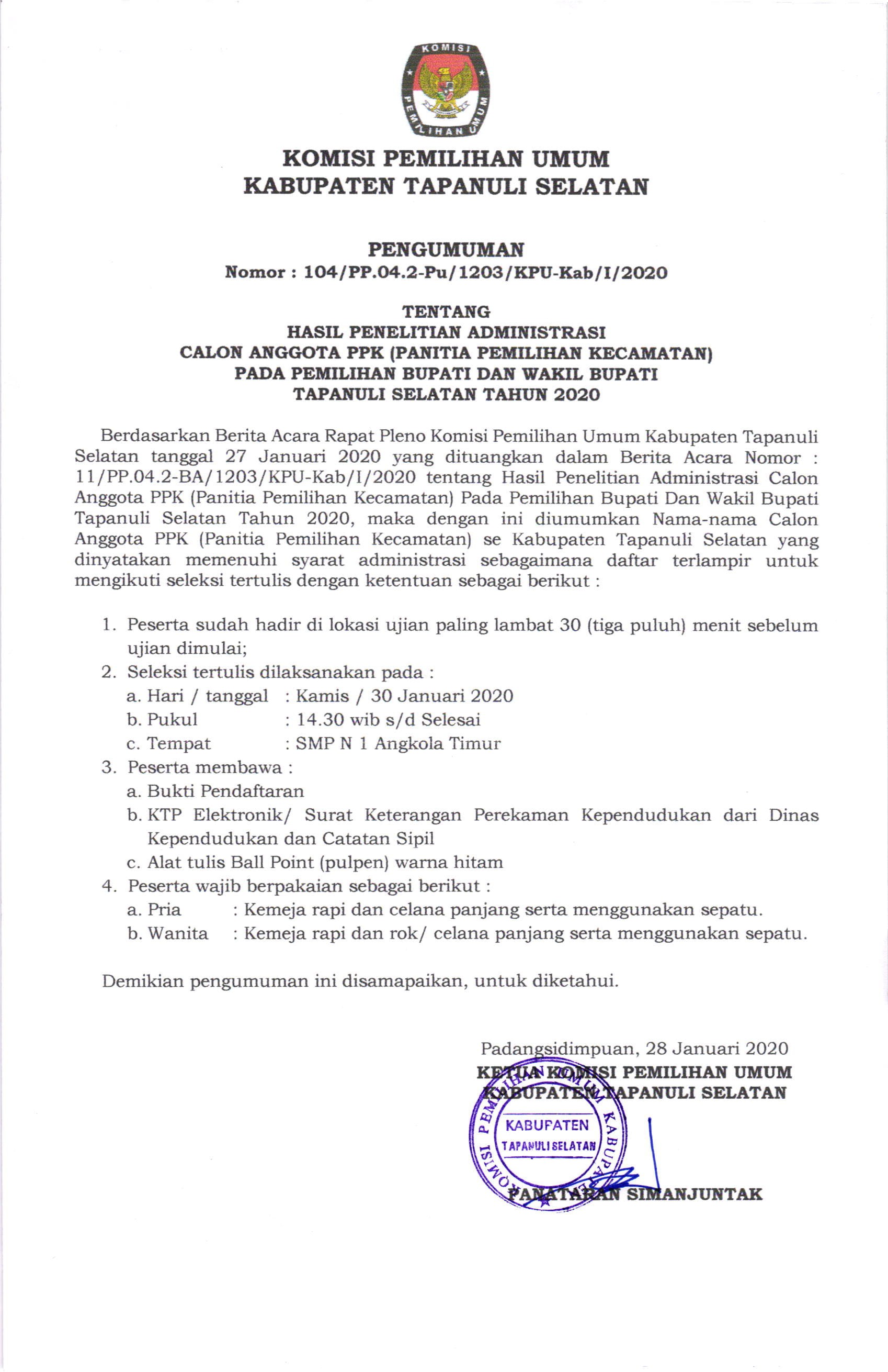 KPU Kabupaten Tapanuli Selatan dengan ini menyampaikan Pengumuman No : 104/PP.04.2-Pu/1203/KPU-Kab/I/2020 tanggal 28 Januari 2020 tentang Hasil Penelitian Administrasi Calon Anggota PPK (Panitia Pemilihan Kecamatan) Pada Pemilihan Bupati dan Wakil Bupati Tapanuli Selatan Tahun 2020. Bagi yang dinyatakan Lulus Seleksi Administrasi, untuk selanjutnya mengikuti Test Tertulis.