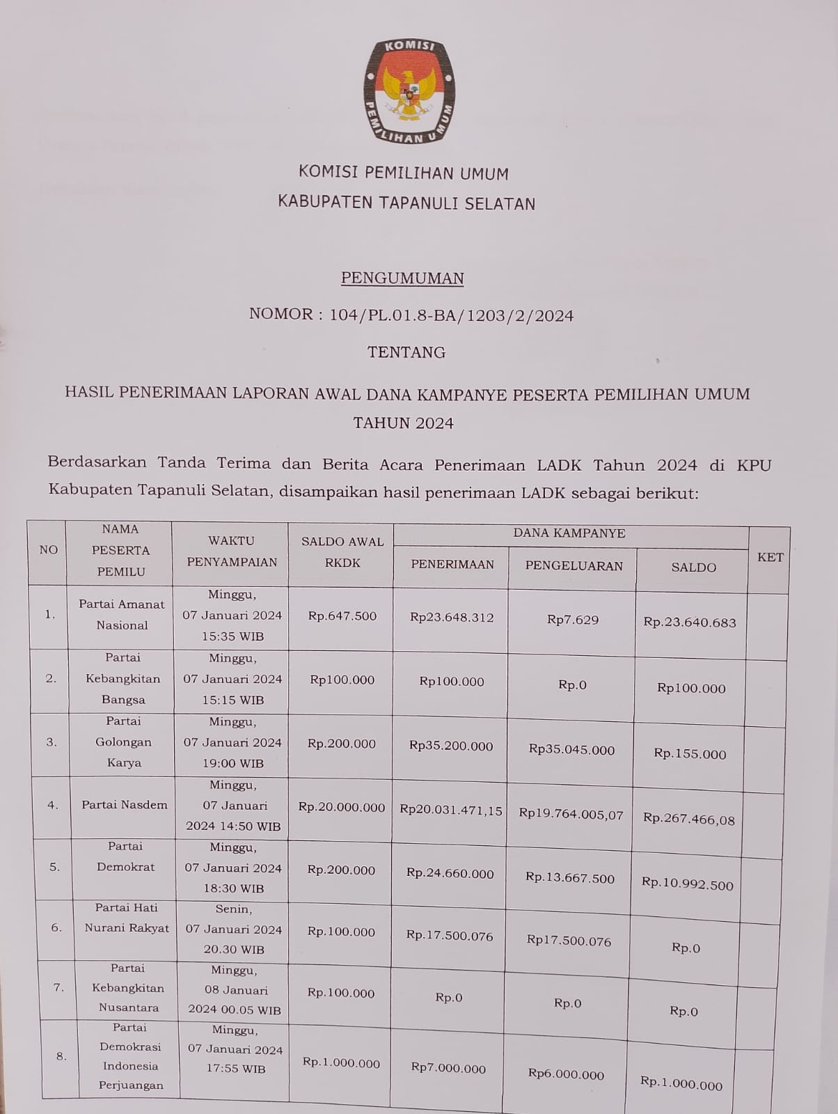 Berikut kami lampirkan Pengumuman Tentang Hasil Penerimaan Laporan Awal Dana Kampanye Peserta Pemilihan Umum Tahun 2024 .#kpumelayani