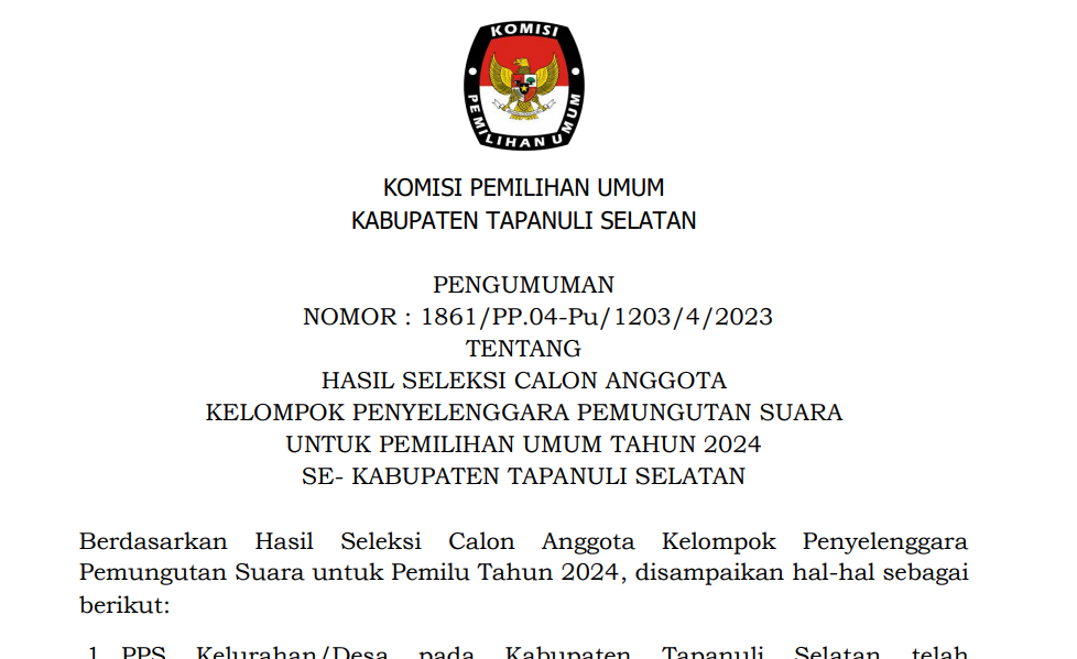 #temanpemilih Berikut kami lampirkan PENGUMUMAN NOMOR : 1861/PP.04-Pu/1203/4/2023 TENTANG HASIL SELEKSI CALON ANGGOTA KELOMPOK PENYELENGGARA PEMUNGUTAN SUARA UNTUK PEMILIHAN UMUM TAHUN 2024 SE- KABUPATEN TAPANULI SELATAN. #kpumelayani #pemiluserentak2024