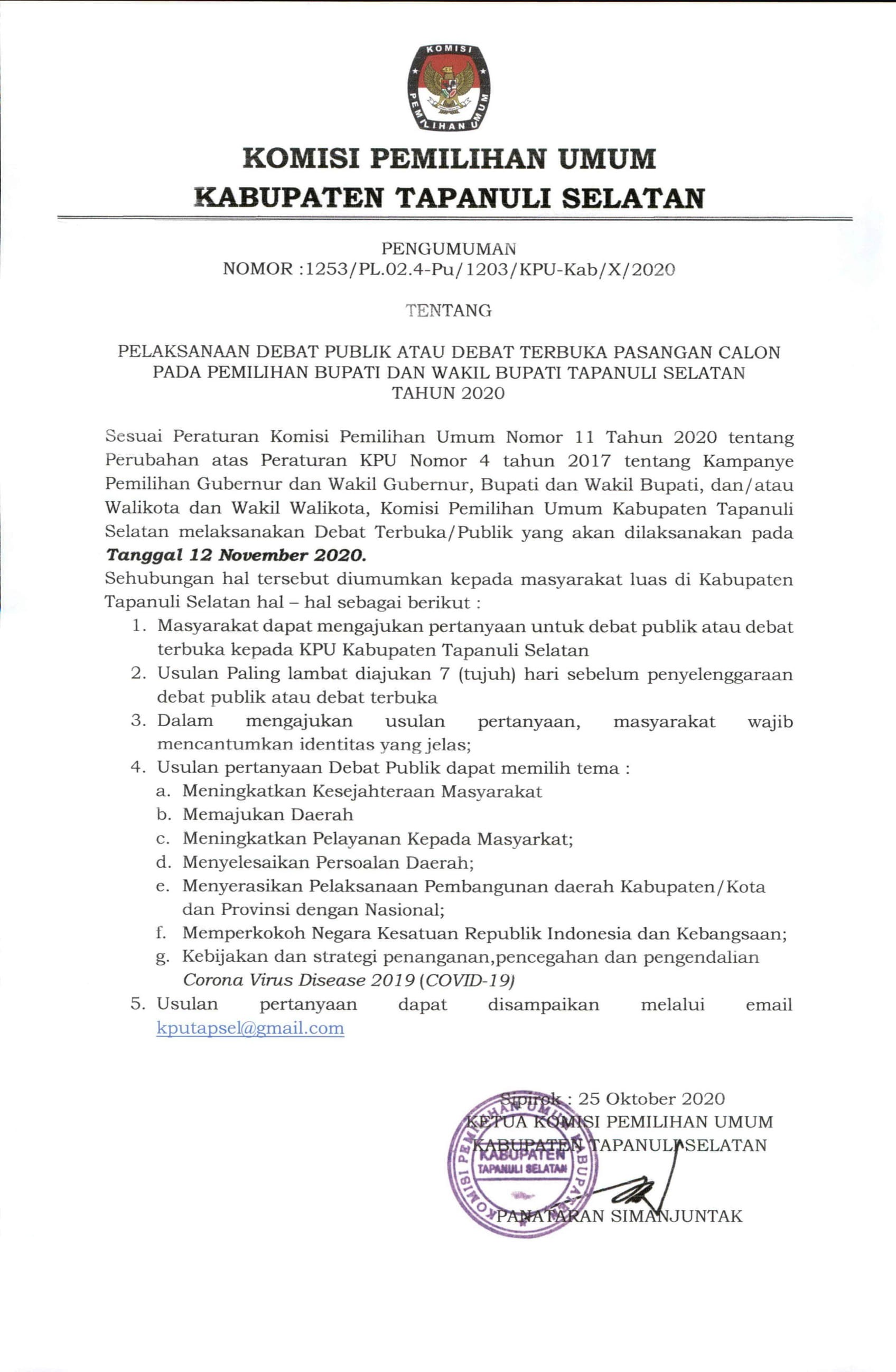 KPU Kabupaten Tapanuli Selatan dengan ini mengumumkan Pelaksanaan Debat Publik atau Debat Terbuka Pasangan Calon Pada Pemilihan Bupati dan Wakil Bupati Tapanuli Selatan Tahun 2020, sebagaimana dalam Pengumuman Nomor : 1253/PL.02.4-Pu/1203/KPU-Kab/X/2020, tanggal 25 Oktober 2020, tentang Pelaksanaan Debat Publik atau Debat Terbuka Pasangan Calon Pada Pemilihan Bupati dan Wakil Bupati Tapanuli Selatan Tahun 2020. Debat akan dilaksanakan pada tanggal 12 November 2020.