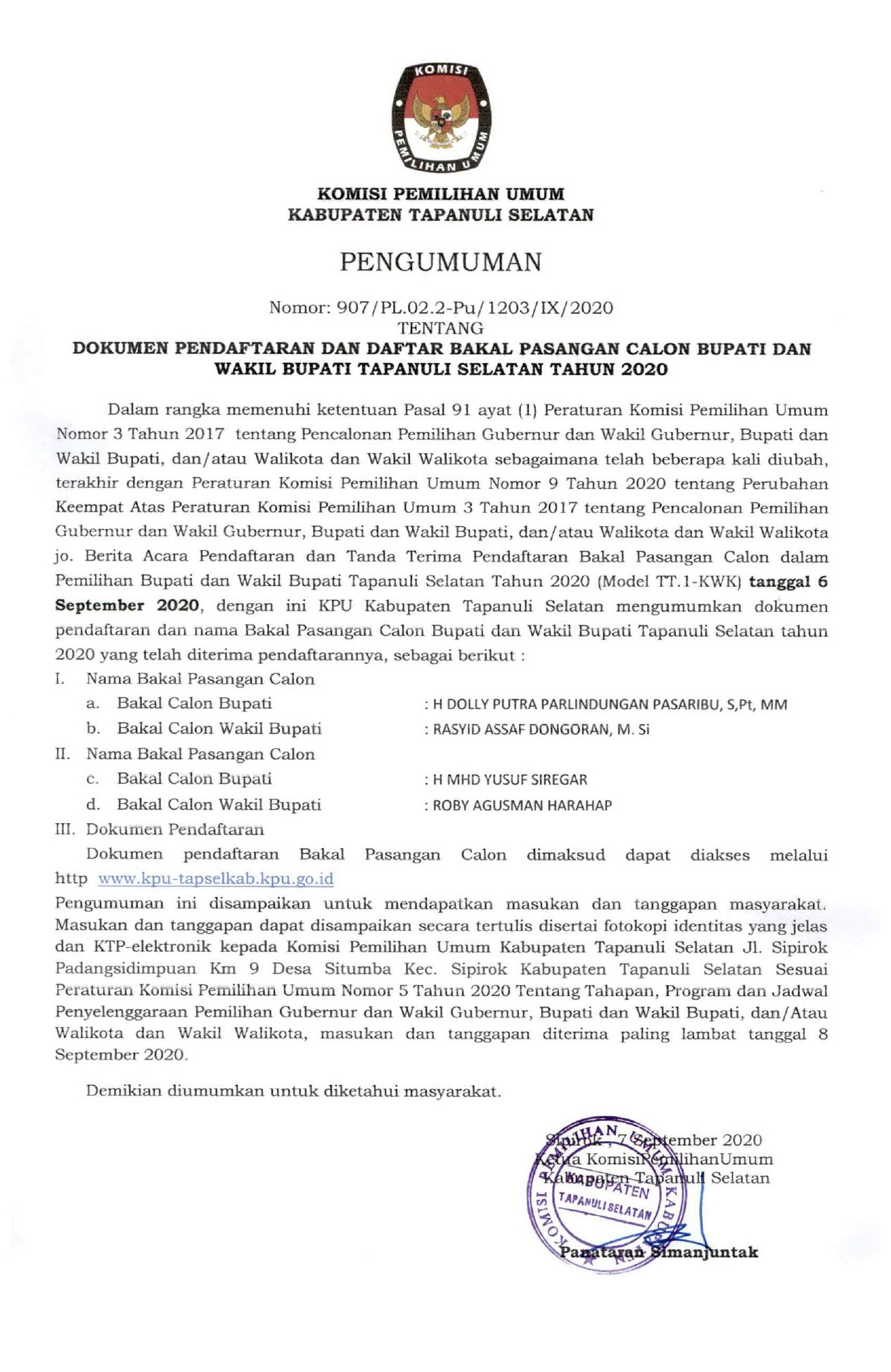 KPU Kabupaten Tapanuli Selatan dengan ini menyampaikan Pengumuman Dokumen Pendaftaran dan Daftar Bakal Pasangan Calon Bupati dan Wakil Bupati Tapanuli Selatan Tahun 2020. Pengumuman tersebut dapat dilihat pada link pdf di bawah ini :