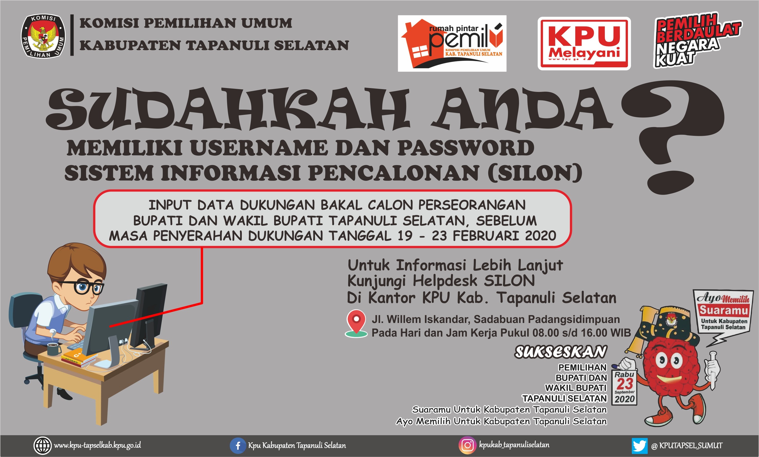 Bagi putera-puteri terbaik bangsa di wilayah Negara Kesatuan Republik Indonesia yang ingin mencalonkan diri menjadi calon Bupati dan Wakil Bupati Tapanuli Selatan Tahun 2020 dari jalur perseorangan, segera datang ke KPU Kabupaten Tapanuli Selatan sebelum masa penyerahan dokumen dukungan calon perseorangan untuk mendapatkan username dan password Sistem Informasi Pencalonan (SILON).