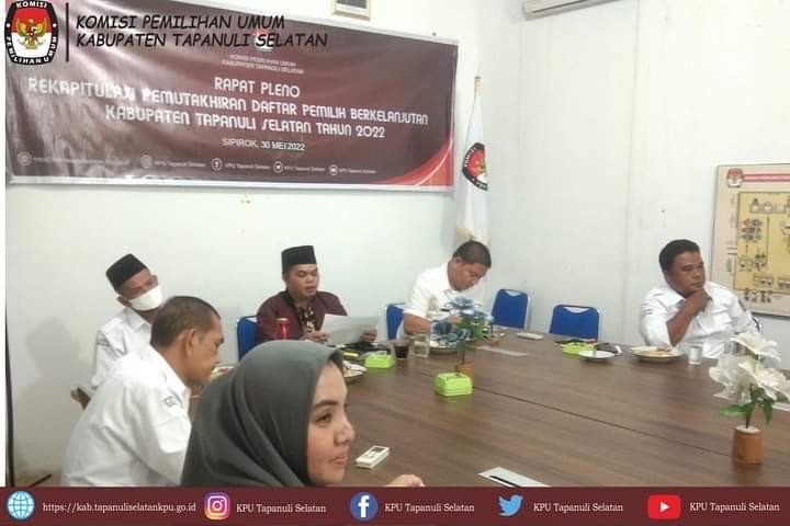 Komisi Pemilihan Umum Kabupaten Tapanuli Selatan melaksanakan Rapat Pleno Rekapitulasi Pemutakhiran Daftar Pemilih Berkelanjutan Periode Mei Tahun 2022 di Tingkat Kabupaten Tapanuli Selatan.