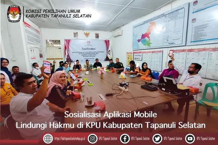 Komisi Pemilihan Umum Kabupaten Tapanuli Selatan, melaksanakan Sosialisasi aplikasi Lindungi Hakmu mobile kepada stake holder di tingkat Kabupaten Tapanuli Selatan. Acara Sosialisasi ini disampaikan oleh Zulhajji Siregar (Divisi Sosialisasi, Pendidikan Pemilih dan Hubungan Partisipasi Masyarakat KPU Kabupaten Tapanuli Selatan) didampingi oleh Panataran Simanjuntak (Ketua KPU Kabupaten Tapanuli Selatan) dan Kemri Syafii (Divisi Hukum dan Pengawasan), dan dipandu oleh Admin/Operator Sistem Informasi Data Pemilih (Sidalih) KPU Kabupaten Tapanuli Selatan, Usman Riharnol Siskandra Siregar.