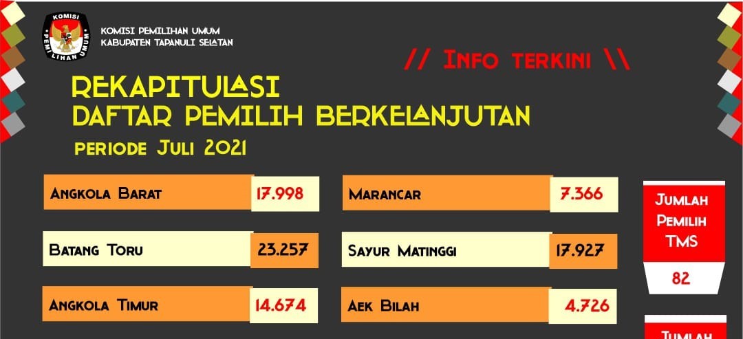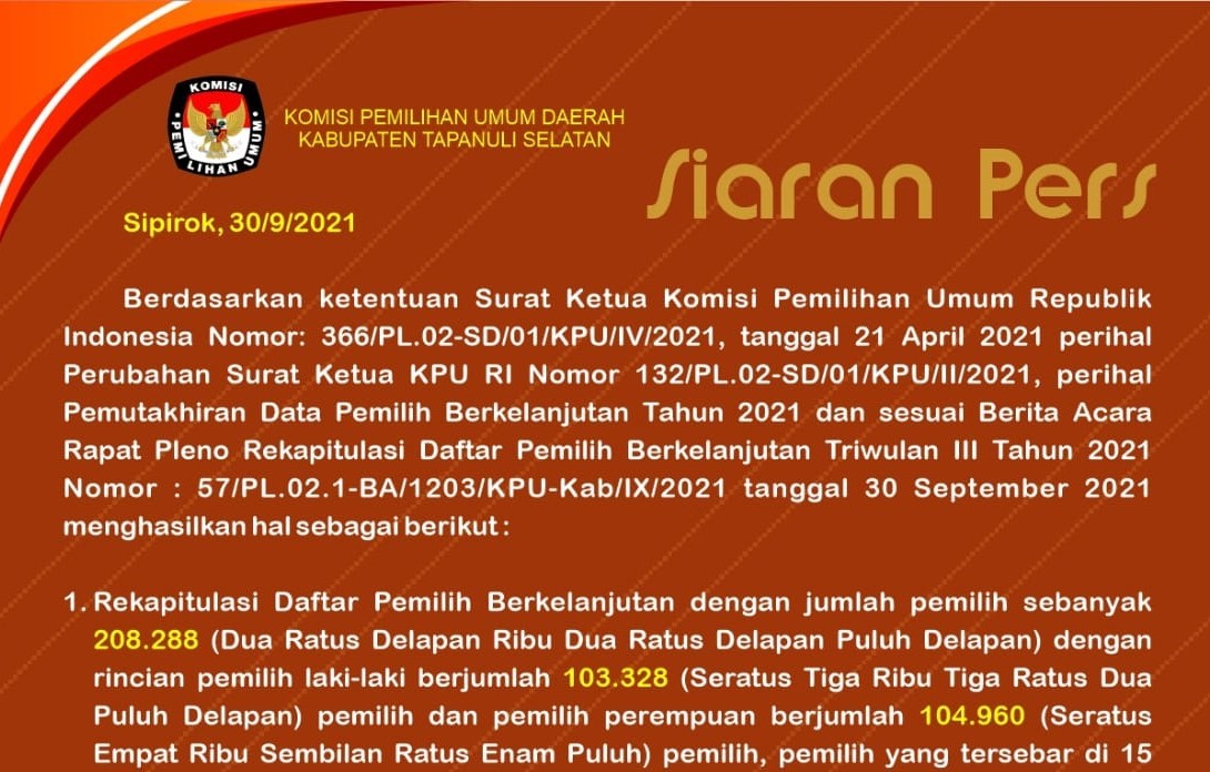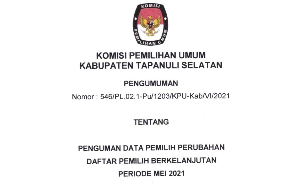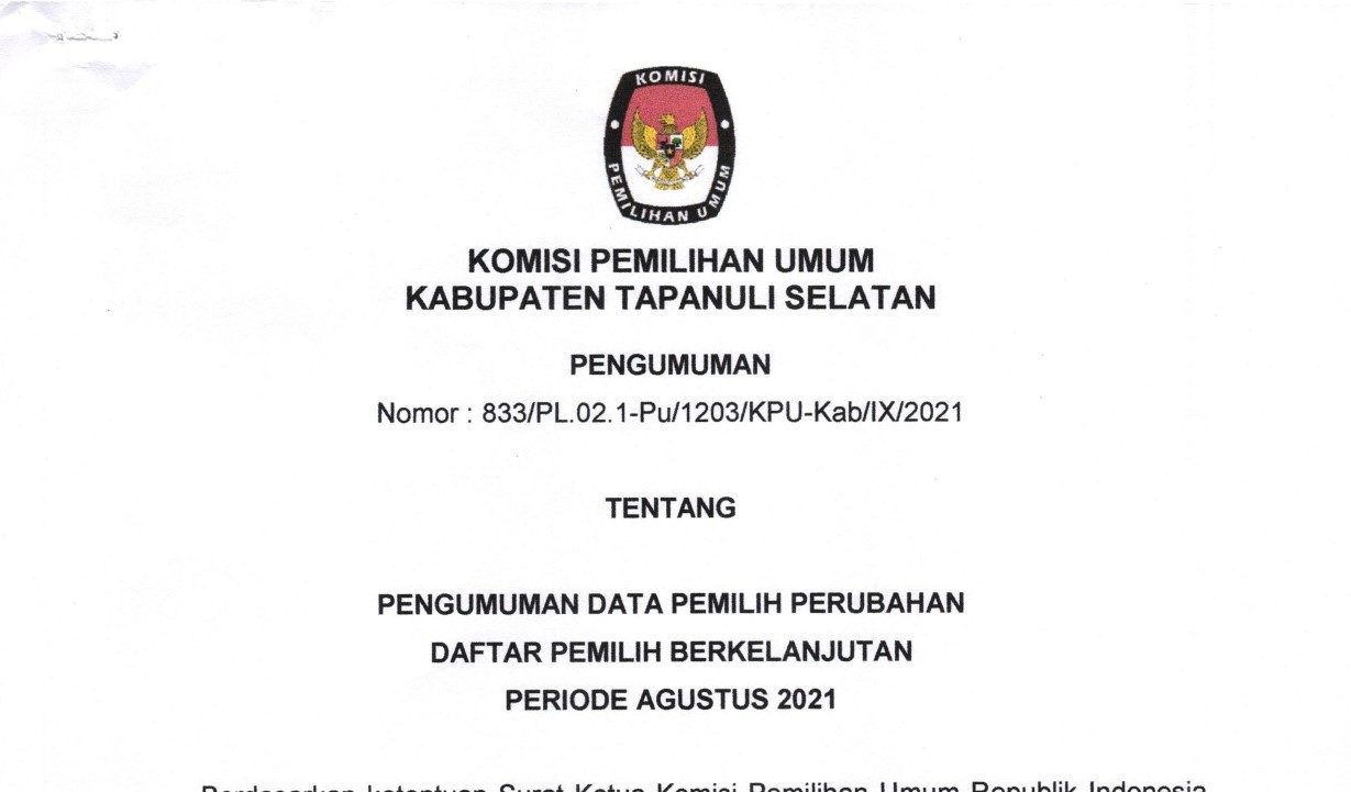 #Teman_Pemilih KPU Kabupaten Tapanuli Selatan mengumumkan Hasil Rapat Koordinasi Daftar Pemilih Berkelanjutan Triwulan III Tahun 2021 Tingkat Kabupaten Tapanuli Selatan yakni Pengumuman Data Pemilih Perubahan Daftar Pemilih Berkelanjutan Tahun 2021 Periode September 2021 dengan Nomor : 930/PL.02.1-Pu/1203/KPU-Kab/IX/2021, tanggal 30 September 2021. KPU Kabupaten Tapanuli Selatan mengharapkan masyarakat memberikan tanggapan masukan terhadap DPB setiap bulannya dapat mengunjungi https://iasndata.kpu-tapselkab.go.id Selengkapnya dapat dilihat dalam link berikut ini : https://kab-tapanuliselatan.kpu.go.id/public/kab-tapanuliselatan/koleksigambar/1637638355WhatsApp-Image-2021-09-30-at-18.53.30-1.jpeg https://kab-tapanuliselatan.kpu.go.id/public/kab-tapanuliselatan/dmdocument/1637676803Pengumuman-PDPB-September-2021.pdf https://kab-tapanuliselatan.kpu.go.id/public/kab-tapanuliselatan/dmdocument/1637676851Form-Model-A-DPB-September-2021-pdf.pdf
