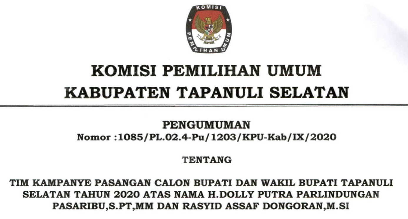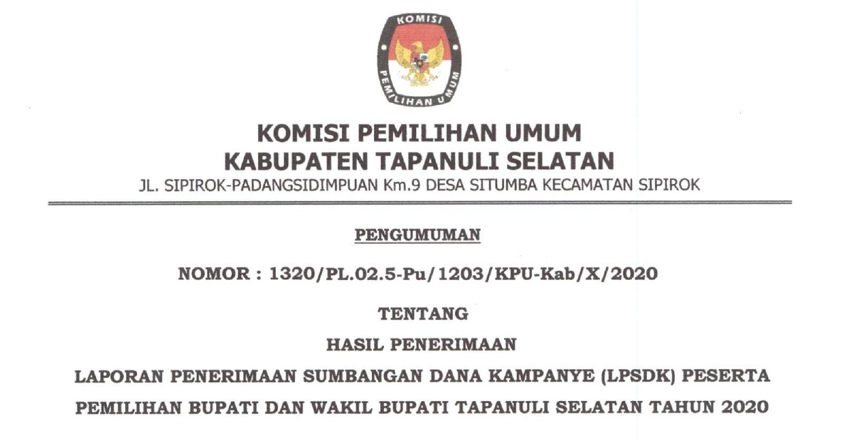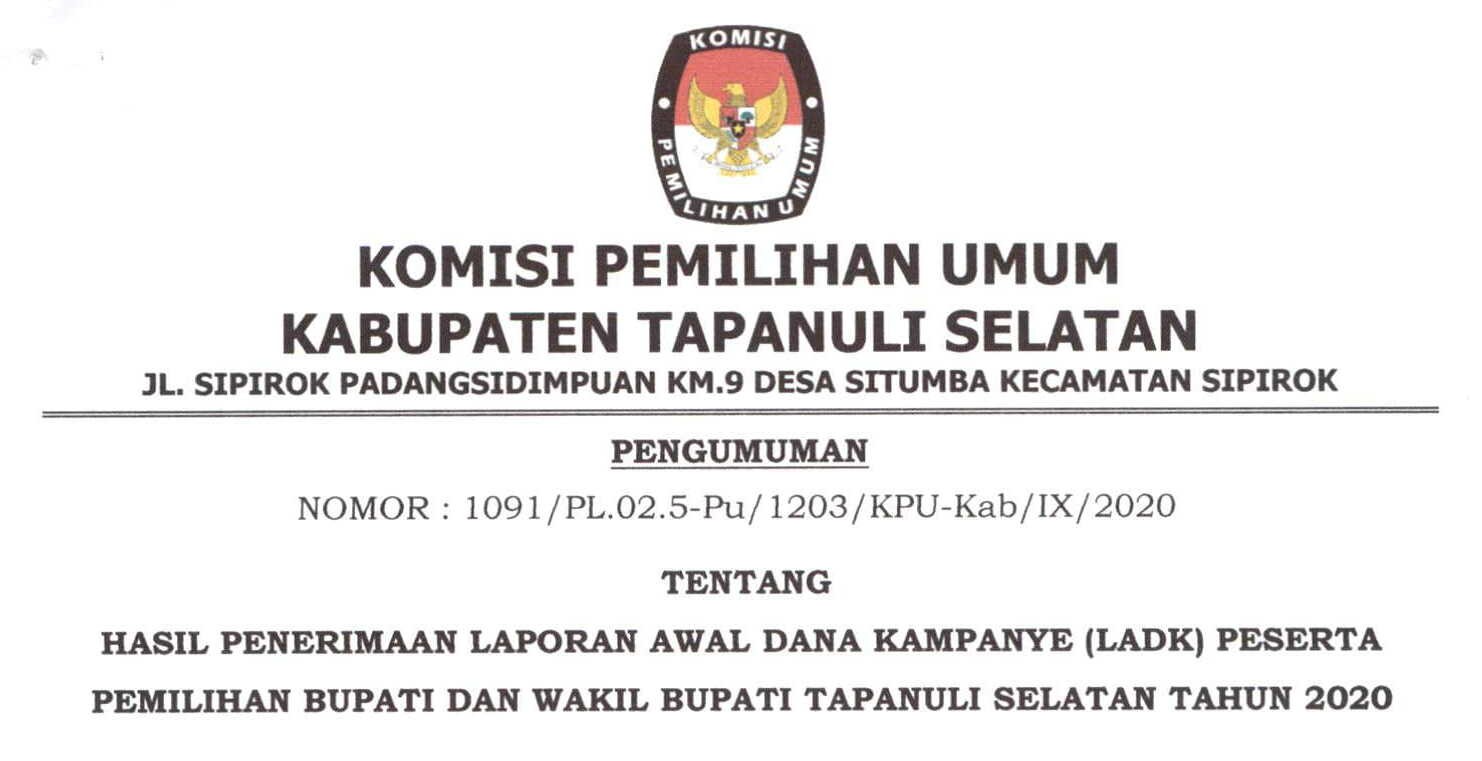 KPU Kabupaten Tapanuli Selatan menyampaikan Pengumuman Nomor : 1091/PL.02.5-Pu/1203/KPU-Kab/IX/2020, tentang Hasil Penerimaan Laporan Awal Dana Kampanye (LADK) Peserta Pemilihan Bupati dan Wakil Bupati Tapanuli Selatan Tahun 2020. Pasangan Calon atas nama H. Dolly Putra Parlindungan Pasaribu, S.Pt, MM dan Rasyid Assaf Dongoran, M.Si.