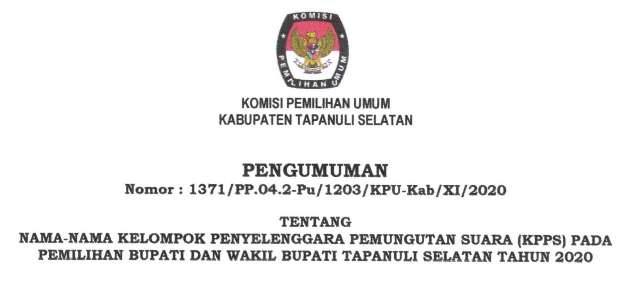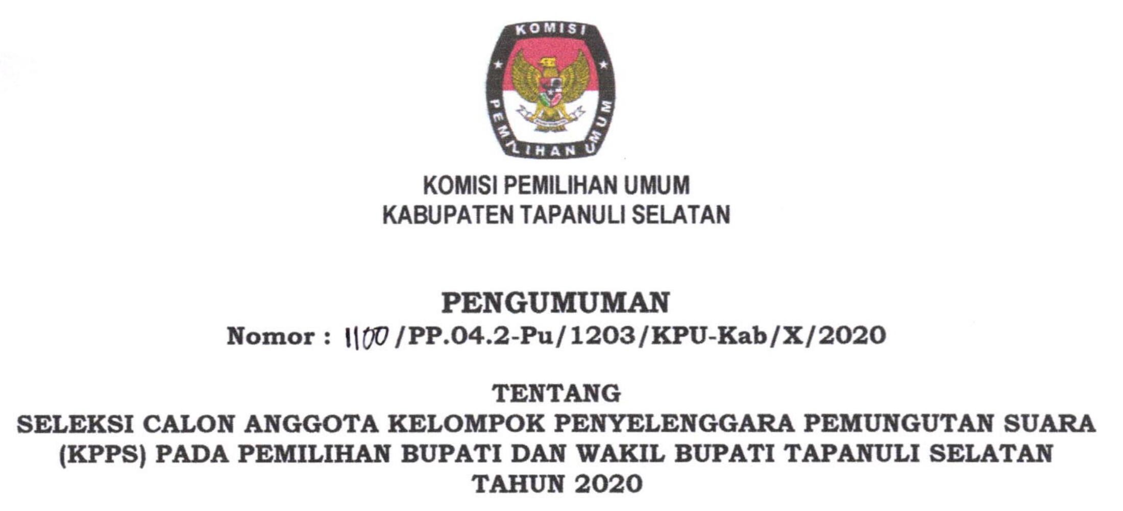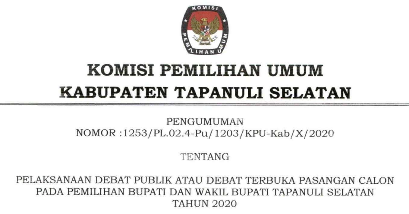 KPU Kabupaten Tapanuli Selatan menyampaikan Pengumuman Nomor : 1091/PL.02.5-Pu/1203/KPU-Kab/IX/2020, tentang Hasil Penerimaan Laporan Awal Dana Kampanye (LADK) Peserta Pemilihan Bupati dan Wakil Bupati Tapanuli Selatan Tahun 2020. Pasangan Calon atas nama H. Dolly Putra Parlindungan Pasaribu, S.Pt, MM dan Rasyid Assaf Dongoran, M.Si.