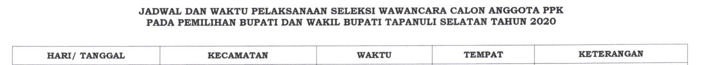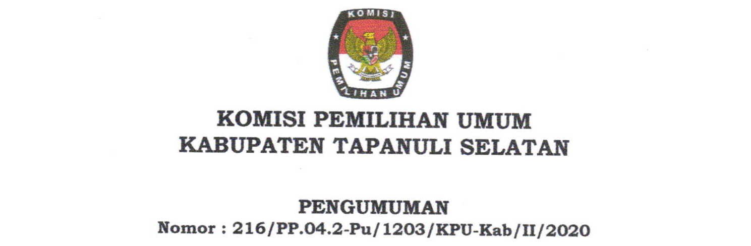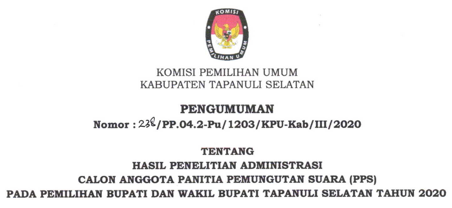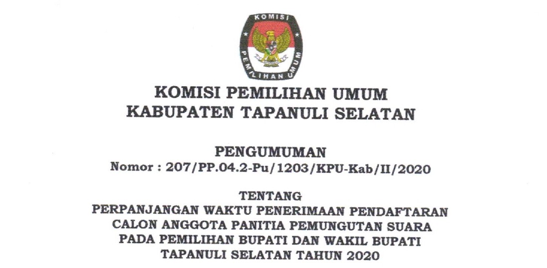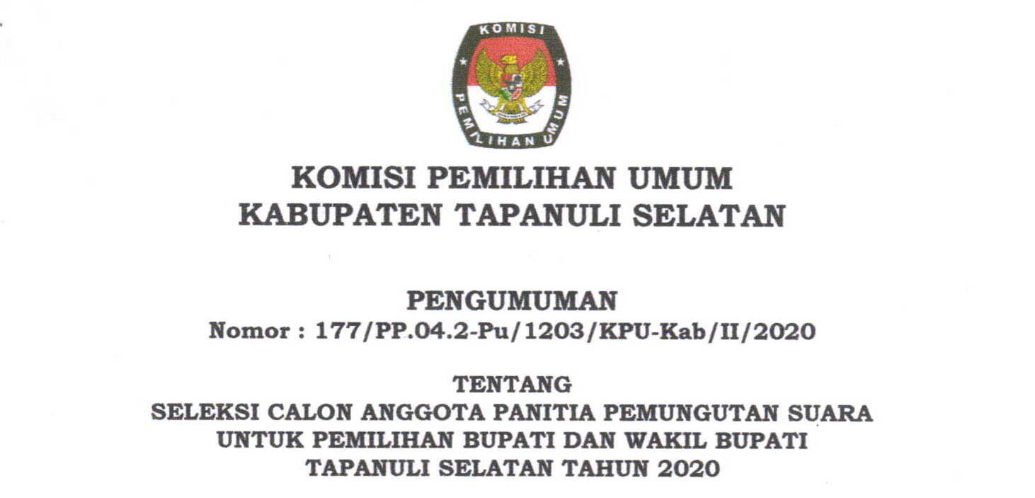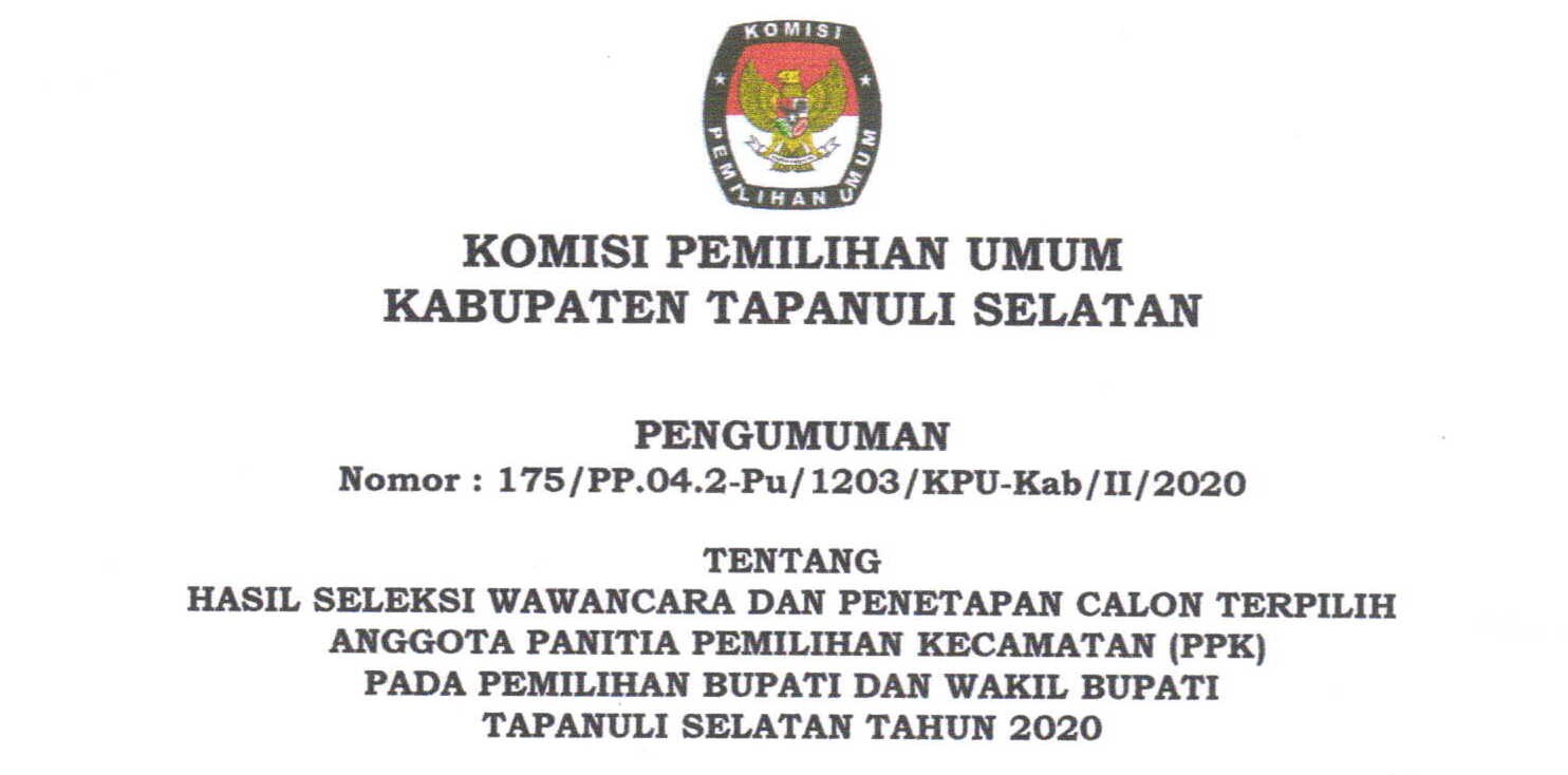 KPU Kabupaten Tapanuli Selatan sesuai dengan hasil Rapat Pleno Tentang Penetapan Calon Anggota Panitia Pemilihan Kecamatan (PPK) Terpilih Pada Pemilihan Bupati dan Wakil Bupati Tapanuli Selatan Tahun 2020 Pasca Hasil Klarifikasi Terhadap Masukan dan Tanggapan Masyarakat Tahap II Atas Hasil Wawancara, dengan ini mengumumkan Calon Anggota Panitia Pemilihan Kecamatan (PPK) Terpilih Pada Pemilihan Bupati dan Wakil Bupati Tapanuli Selatan Tahun 2020. Sehubungan dengan itu, Anggota Panitia Pemilihan Kecamatan Terpilih agar mempersiapkan diri untuk mengikuti pengambilan Sumpah/Janji Panitia Pemilihan Kecamatan Pada Pemilihan Bupati dan Wakil Bupati Tapanuli Selatan Tahun 2020, pada : Hari/Tanggal : Sabtu, 29 Februari 2020 Pukul : 09.30 WIB s/d Selesai Tempat : Aula Syaakira The View and Resto Desa Aek Sabaon Kecamatan Marancar Pakaian : Baju putih lengan panjang dan celana hitam serta memakai peci hitam (Laki-laki) Baju putih lengan panjang dan rok/celana hitam (Perempuan) Catatan : Hadir 30 menit sebelum acara dimulai. Isi Pengumuman dapat dilihat selengkapnya pada link pdf di bawah ini : https://kab-tapanuliselatan.kpu.go.id/public/kab-tapanuliselatan/dmdocument/1637765833PENGUMUMAN-PENETAPAN-CALON-ANGGOTA-PPK-TERPILIH.pdf