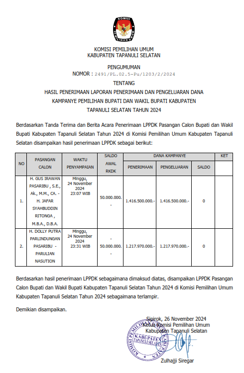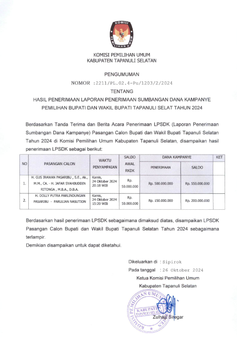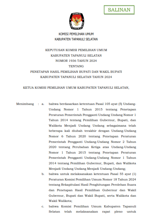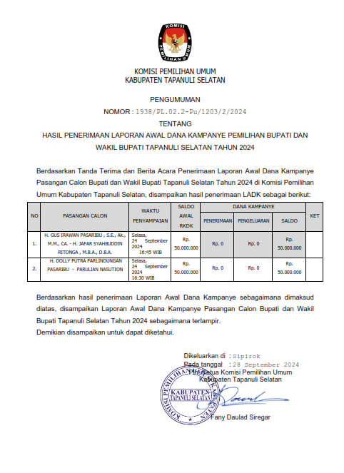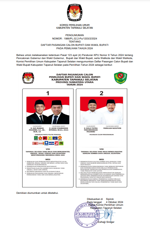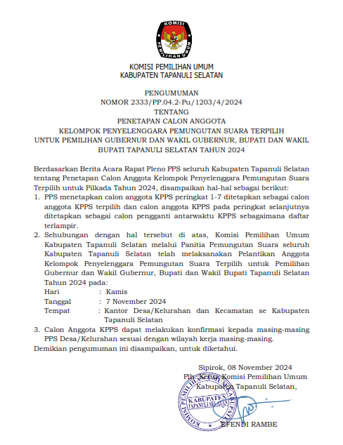 BARIKUT KAMI SAMPAIKAN PENGUMUMAN NOMOR : 2333/PP.04.2-Pu/1203/4/2024 TENTANG PENETAPAN CALON ANGGOTA KELOMPOK PENYELENGGARA PEMUNGUTAN SUARA TERPILIH UNTUK PEMILIHAN GUBERNUR DAN WAKIL GUBERNUR, BUPATI DAN WAKIL BUPATI TAPANULI SELATAN TAHUN 2024 PENGUMUMAN NOMOR : 2333/PP.04.2-Pu/1203/4/2024