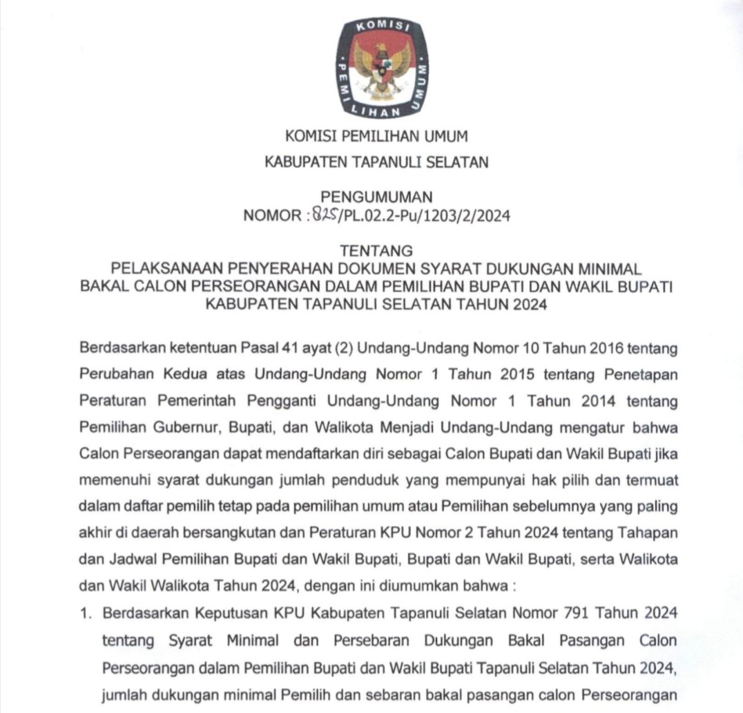 Pengumuman Pelaksanaan Penyerahan Dokumen Syarat Dukungan Minimal Bakal Calon Perseorangan Dalam Pemilihan Bupati dan Wakil Bupati Kabupaten Tapanuli Selatan Tahun 2024