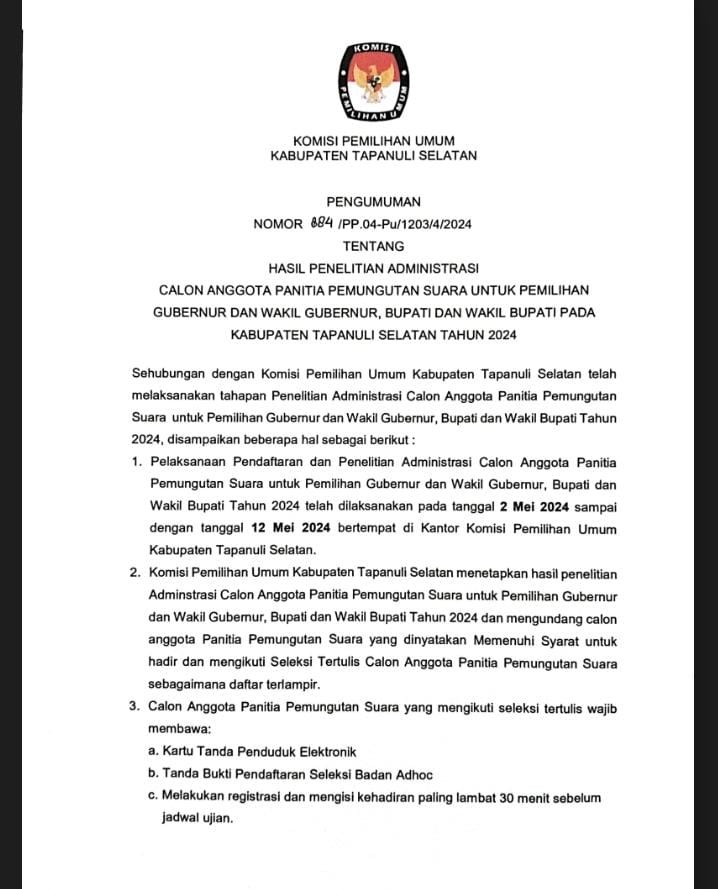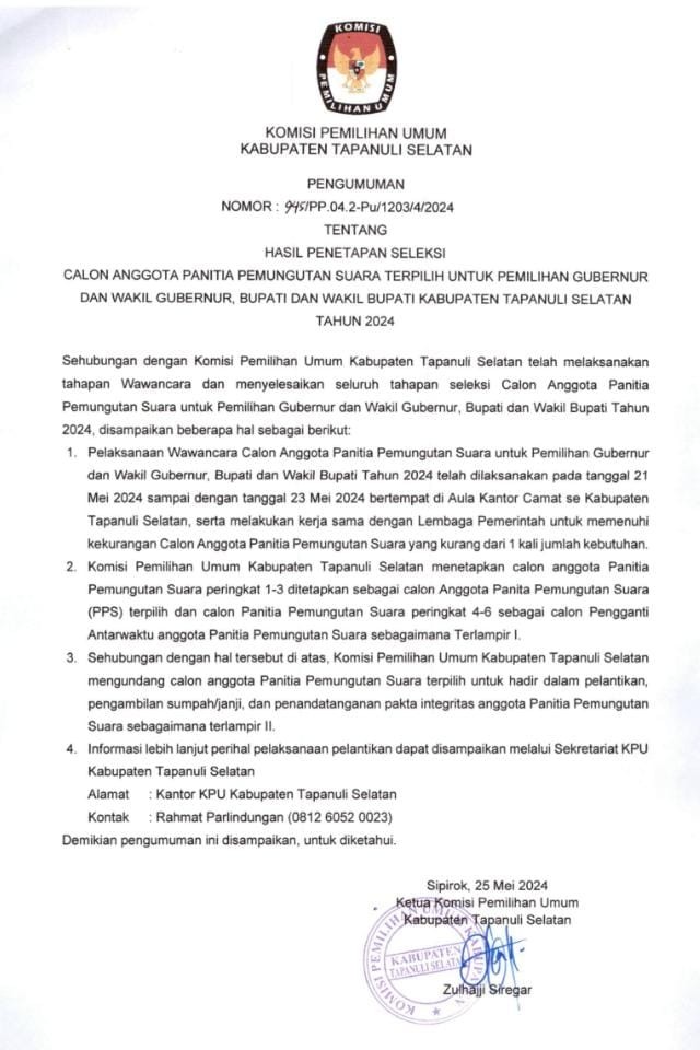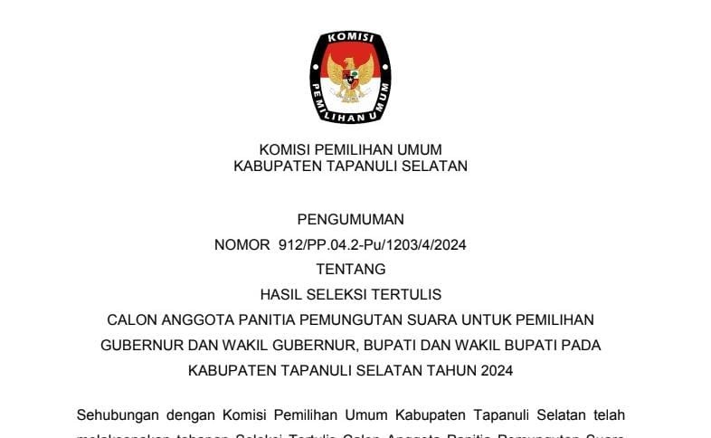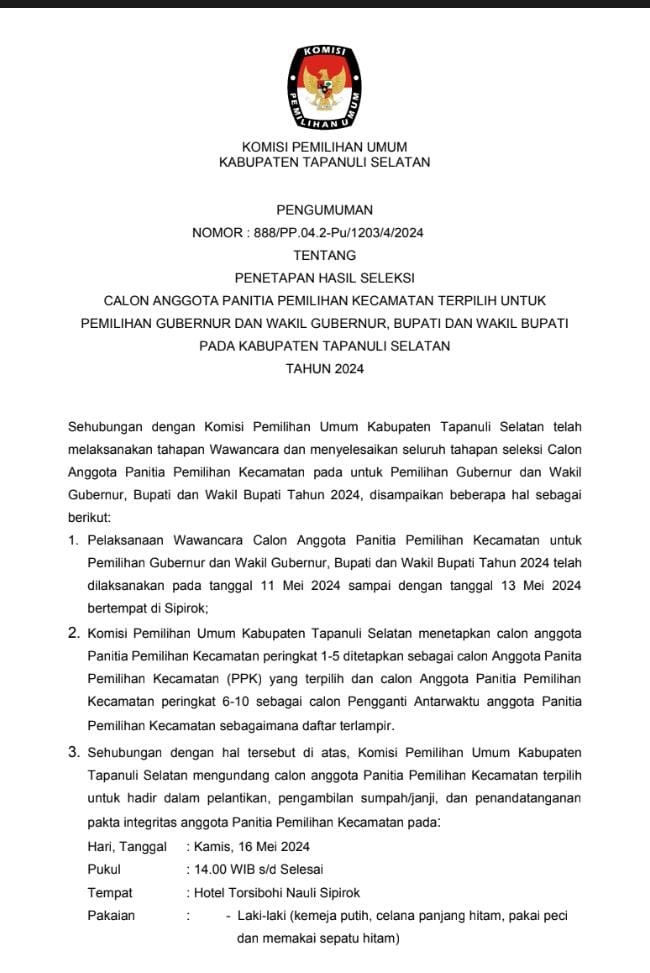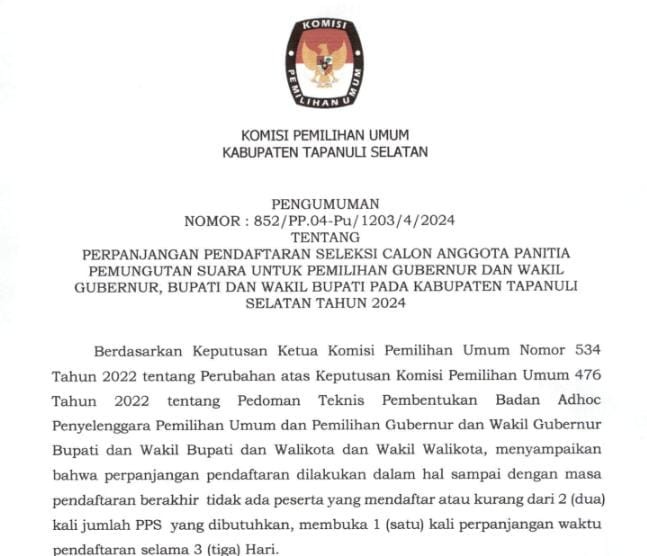 Pengumuman Nomor : 852/PP.04-PU/1203/4/2024 Tentang Perpanjangan Pendaftaran Seleksi Calon Anggota PPS untuk Pemilihan Gubernur dan Wakil Gubernur, Bupati dan Wakil bupati pada Kabupaten Tapanuli Selatan Tahun 2024