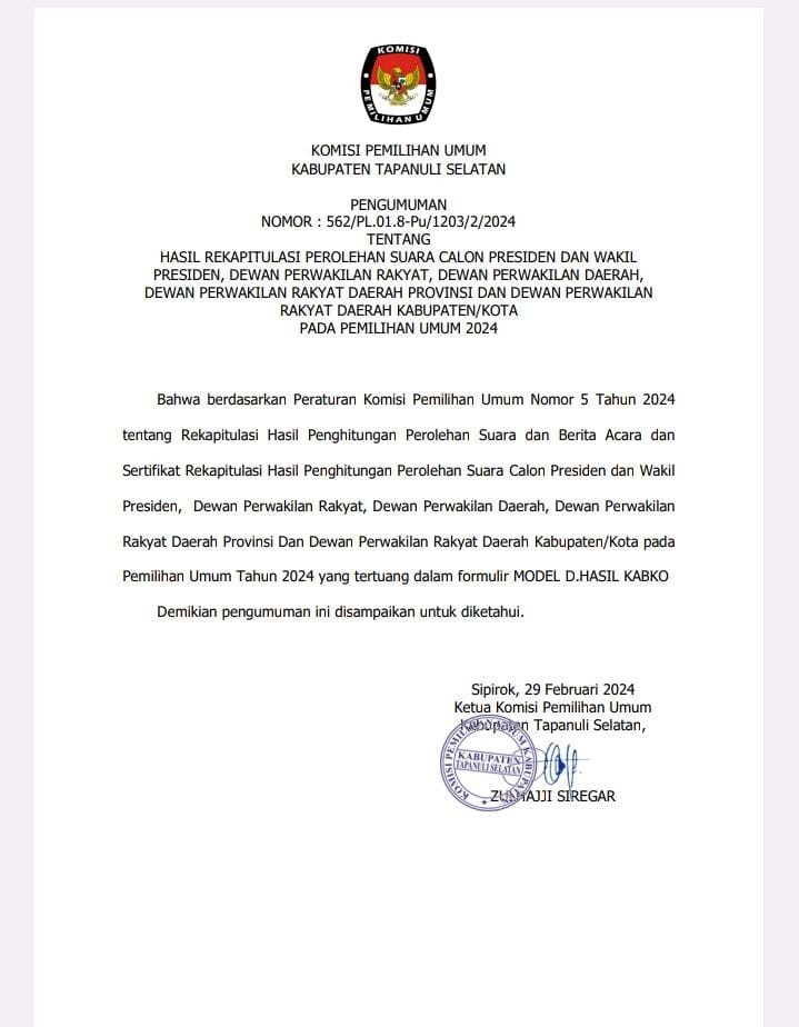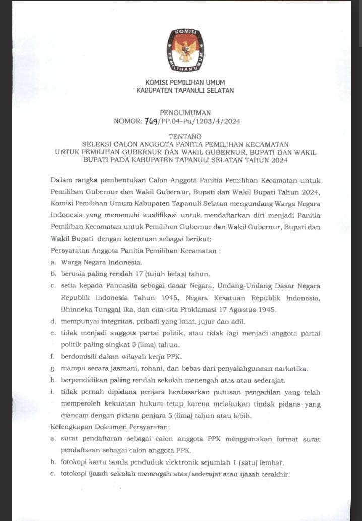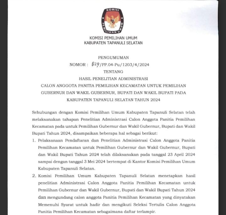 #temanpemilih Berikut kami lampirkan PENGUMUMAN NOMOR : 1861/PP.04-Pu/1203/4/2023 TENTANG HASIL SELEKSI CALON ANGGOTA KELOMPOK PENYELENGGARA PEMUNGUTAN SUARA UNTUK PEMILIHAN UMUM TAHUN 2024 SE- KABUPATEN TAPANULI SELATAN. #kpumelayani #pemiluserentak2024
