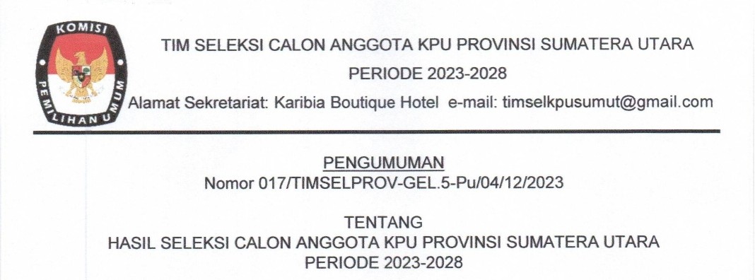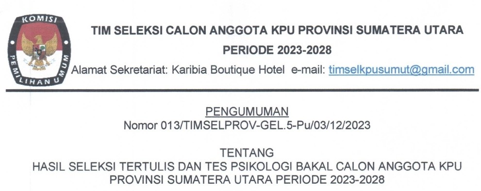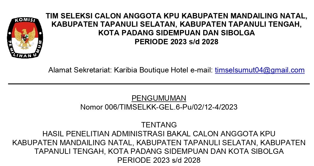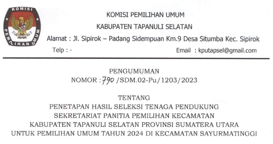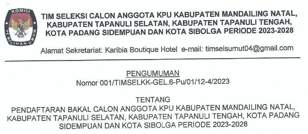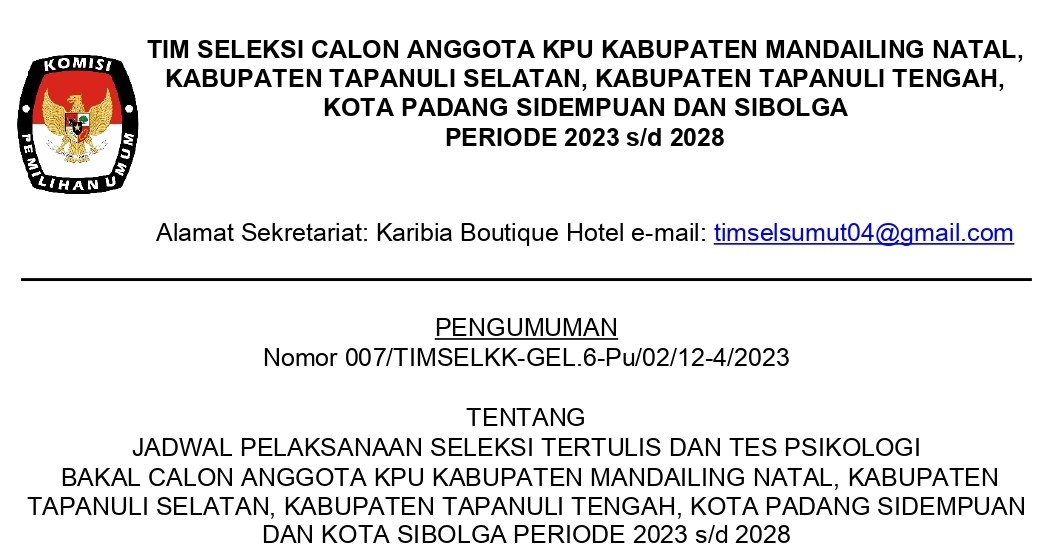 KPU Kabupaten Tapanuli Selatan dengan ini menyampaikan Pengumuman Tim Seleksi Calon Anggota KPU Kabupaten Mandailing Natal, Kabupaten Tapanuli Selatan, Kabupaten Tapanuli Tengah, Kota Padang Sidempuan dan Kota Sibolga Periode 2023 s/d 2028, nomor : 007/TIMSELKK-GEL.6-Pu/02/12-4/2023, tanggal 5 Juli 2023, tentang Jadwal Pelaksanaan Seleksi Tertulis dan Tes Psikologi Bakal Calon Anggota KPU Kabupaten Mandailing Natal, Kabupaten Tapanuli Selatan, Kabupaten Tapanuli Tengah, Kota Padang Sidempuan dan Kota Sibolga Periode 2023 s/d 2028.