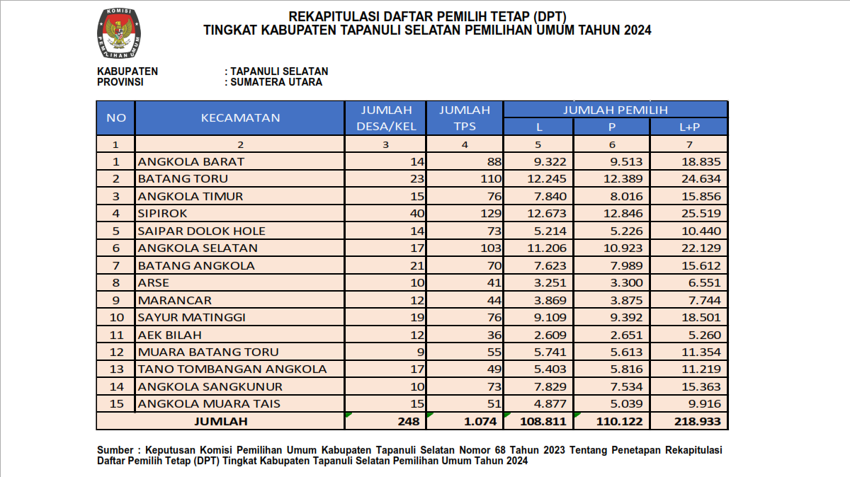Berikut kami sampaikan Rekapitulasi Daftar Pemilih Tetap (DPT) Tingkat Kabupaten Tapanuli Selatan Pemilihan Umum Tahun 2024. <SILAHKAN KLIK DISINI>